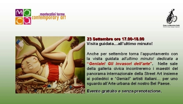 Anche a settembre l’appuntamento con la visita guidata all’ultimo minuto, alla temporanea “Geniale! Gli invasori dell’arte”. Nelle sale della galleria civica incontreremo i maestri del panorama internazionale della Street Art insieme ai poliedrici e “Geniali” artisti italiani… per uno sguardo all’Arte urbana del nostro Bel Paese.