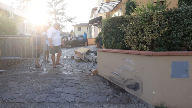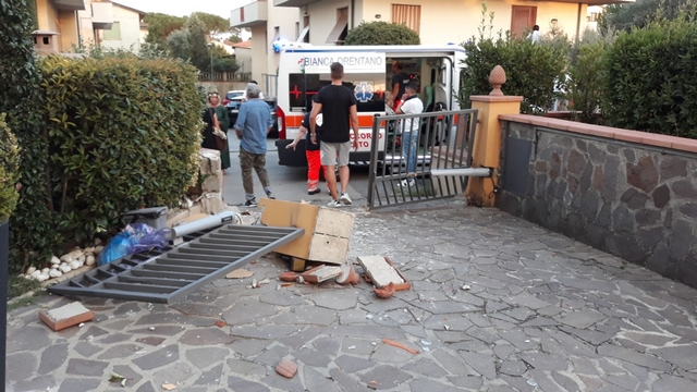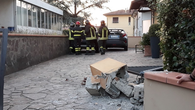 L'auto, proveniente dal parcheggio di fronte, ha divelto un pilone e buttato giù parte del cancello automatico. Si è scontrata contro il muro di cinta della palazzina all'angolo tra via Indipendenza e via del Vino e ha strusciato lungo tutto il muretto, per poi tamponare un'altra vettura parcheggiata in fondo al vialetto.