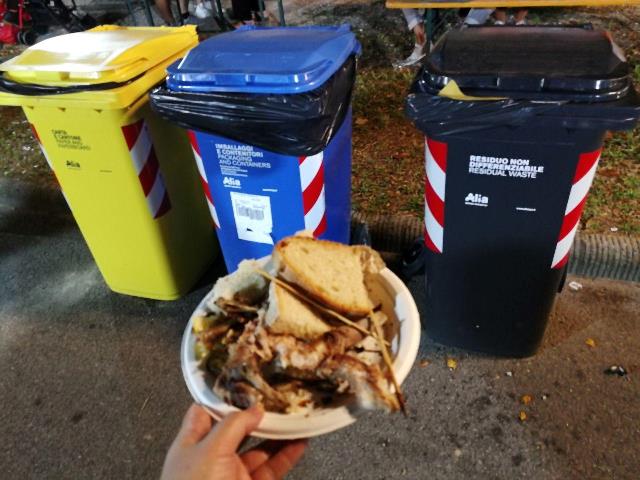 Sottolineiamo che nessuno stand gastronomico aveva il contenitore più importante di tutti: quello dell'umido (il santo graal della Raccolta Differenziata). Questa incredibile assenza mandava a monte anche lo sforzo fatto (in realtà da pochissimi stand) di offrire piatti e/o stoviglie biodegradabili.