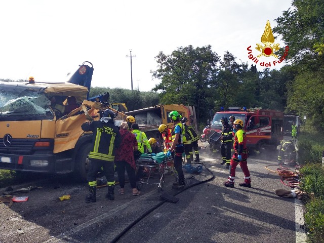 Estratto il conducente del camion affidato successivamente al personale sanitario del 118. Il medico del 118 ha constatato il decesso di un uomo che si trovava alla guida di un autovettura. Sul posto la polizia locale.