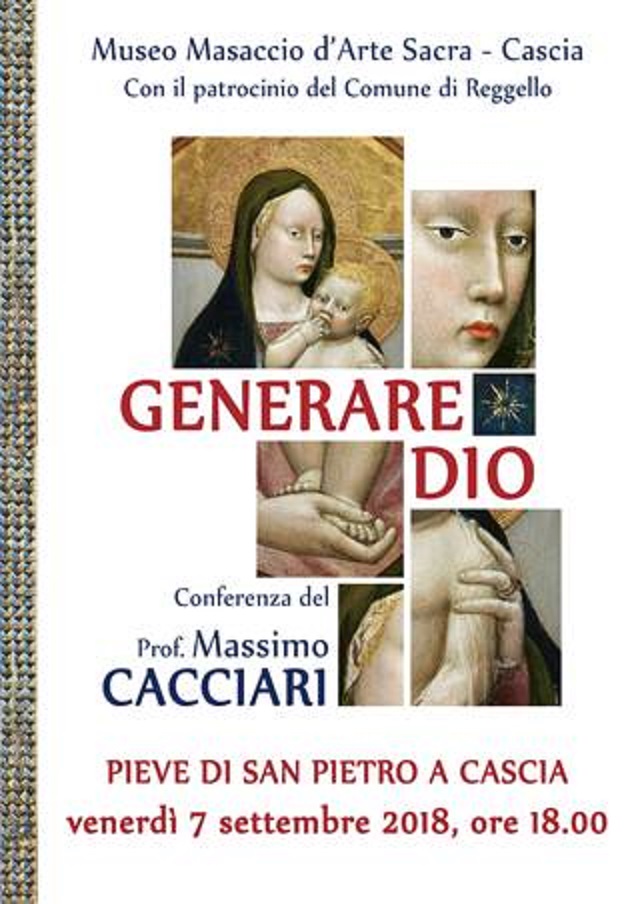 Il Professor Massimo Cacciari al Museo di Arte Sacra. Una prestigiosissima presenza è prevista per venerdì prossimo 7 settembre nel territorio reggellese, al museo di Cascia alle ore 18. L’iniziativa, con il patrocinio del Comune di Reggello, si intitola “Generare Dio”. La conferenza è incentrata sulla figura della Vergine attraverso le icone che l'hanno rappresentata nel corso di secoli d'arte sacra, tra le quali le madonne di Masaccio. Il professor Cacciari ha affrontato questo tema nell'ultima delle sue pubblicazioni, dove il mistero dell'incarnazione viene indagato nell'ottica della Donna che ha avuto il compito di generare Dio .