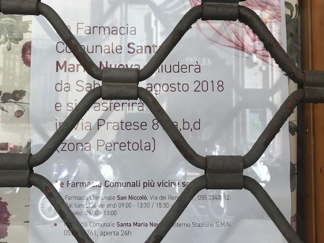 "Nel silenzio agostano, è stata chiusa definitivamente la Antica Farmacia dell'Ospedale di Santa Maria Nuova, in via Bufalini. Un cartello apposto sui vetri informa che la farmacia si trasferirà a Peretola, in via Pratese, cioè dall'altro capo della città. Ci auguriamo che il Comune di Firenze (visto che la struttura in questione fa parte delle Farmacie Comunali) sappia dare una spiegazione credibile a questa decisione folle e incomprensibile". Lo afferma il vicepresidente del Consiglio regionale della Toscana, Marco Stella (Forza Italia), che sul tema ha presentato un'interrogazione a risposta scritta.