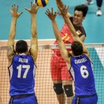 Il primo punto è di Miao per la Cina. Gli asiatici iniziano assai bene la sfida piazzando un parziale di 3-6 in proprio favore. La ricezione azzurra non è perfetta e Zaytsev si fa murare da Rao per il 3-7. Un servizio vincente dello “zar” Zaytsev rintuzza lo svantaggio (4-7) ma poco dopo il neo giocatore di Modena non si ripete e manda fuori. Mazzone entra sul taraflex e si fa subito valere mettendo a terra una veloce. Molto bravo è il cinese Jiang, che continua a martellare: la Cina tocca quota 10 con l’Italia ancora ferma a 7. Il numero 2 della Nazionale asiatica si fa valere anche dai nove metri piazzando un ace che dà il +4 alla squadra ospite (8-12). L’Italia tuttavia è fallosa al servizio e anche Juantorena sbaglia al suo turno di battuta. Quando Liu mura Zaytsev è 9-14 per la Cina, punteggio sul quale coach Blengini chiama time out per parlare con i suoi giocatori. E’ il momento dei centrali: prima colpisce Anzani e poi replica con egual moneta il cinese Rao. La combinazione Giannelli-Anzani funziona, ma la Cina non molla di un centimetro e mantiene il vantaggio. Ora il servizio dà i suoi frutti e Juantorena trova un bellissimo ace. Ed è proprio grazie alla battuta che gli azzurri si riportano fino al -1: 22-23 dopo le splendide esecuzioni di Zaytsev prima e di Candellaro dopo. Ma Jiang dà il set point ai cinesi (22-24). L’Italia rientra e pareggia dopo un’azione lunghissima chiusa da Juantorena. Un attacco out di Jiang dà il primo set point all’Italia ma Zaytsev incrocia la schiacciata fuori di pochissimo. Si prosegue ai vantaggi, la Cina si aggiudica il primo parziale con l’ace finale del numero 10 Ji (27-29). Sei i punti di Jiang, per l’Italia sono 7 quelli di Juantorena.