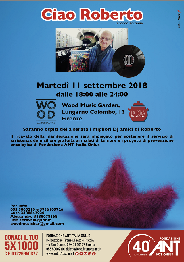 Martedì 11 settembre, al Wood Music Garden in Lungarno Colombo a Firenze, si ripeterà per il secondo anno una serata di musica e solidarietà in ricordo di Roberto Bianchi, proprietario di Disco Mastelloni di Firenze, dedicata a Fondazione ANT.