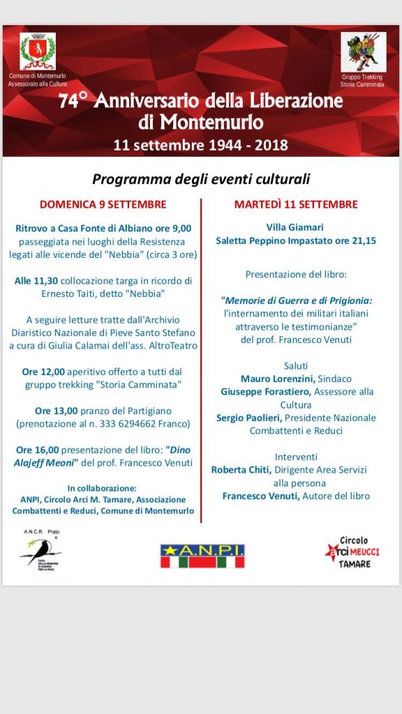 Le celebrazioni della festa della liberazione di Montemurlo proseguiranno, sempre domani 11 settembre, alle ore 21 in Villa Giamari- saletta Peppino Impastato (piazza Don Milani, 2) con la presentazione del libro di Francesco Venuti “Internati militari italiani nella Seconda Guerra Mondiale”, a cui seguirà una video proiezione a cura dell'associazione Combattenti e reduci di Prato. Interverranno l’autore e il sindaco Lorenzini che porterà il saluto dell’amministrazione comunale.
