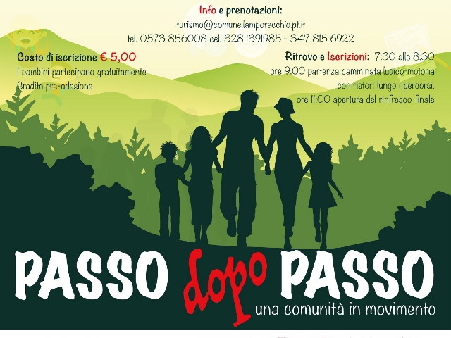 Domenica 16 settembre 2018 si terrà a Lamporecchio, per il secondo anno consecutivo, “Passo dopo Passo - una comunità in movimento”, la camminata ludico-motoria che lo scorso anno ha visto la partecipazione di ben oltre 350 persone. Passo dopo Passo sarà anche quest’anno un’iniziativa non competitiva aperta a tutti, con due percorsi di diversa difficoltà e lunghezza (5 km e 13 km) adatta a tutti: sportivi, appassionati di trekking, famiglie e gruppi che vogliono stare insieme con l’occasione di una camminata, anche in compagnia dei propri amici a quattro zampe.