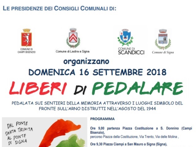 Domenica 16 settembre dalle ore 9 si terrà l'evento Liberi di Pedalare. Pedalata sui sentieri della memoria attraverso i luoghi simbolo del fronte sull'Arno distrutti nell'agosto del 1944.