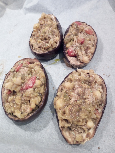 Tagliate le melanzane a metà per la lunghezza e infornatele a 170 gradi in forno preriscaldato ricoperte con carta da forno per circa 25 minuti. Scavatele con un cucchiaio ricavando delle barchette. metteteci un pochino di olio e salatele leggermente all’interno, poi disponetele in una pirofila, io le ho lasciate sulla leccarda del forno con sotto la carta da forno. Sminuzzate la polpa prelevata e tenetela da parte per mescolarla agli altri ingredienti del ripieno. Stufate delicatamente in una padella coperta con 2-3 cucchiai d’olio la cipolla e l’aglio tritati, il rosmarino, i pomodorini a tocchetti e la polpa ricavata dalle melanzane. Frullate metà ceci che avete precedentemente cotto e teneteli da parte. Quando i pomodori sono appassiti unite i ceci interi e proseguite ancora per 10 minuti. Ora amalgamate anche i ceci frullati, lasciateli insaporire per 3-4 minuti e alla fine salate. Farcite con il ripieno le melanzane svuotate e spolverizzate con un miscuglio di pangrattato e origano. Cospargetele con poco olio e infornatele a 170 gradi per una ventina di minuti. Aspettate 10 minuti prima di servire.