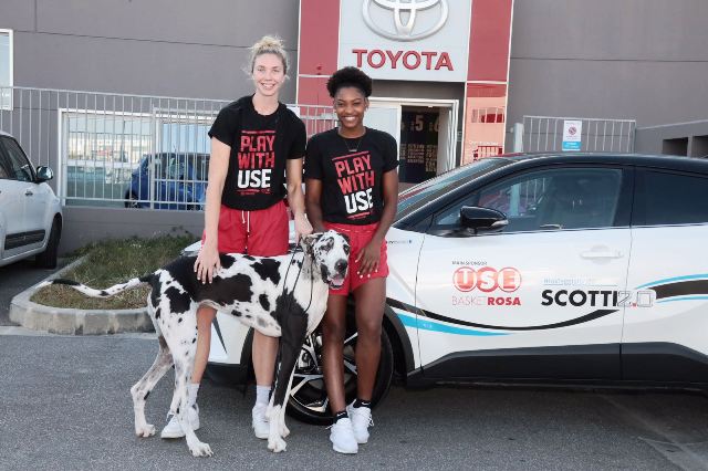 Quest’anno oltre al logo sulla magia da gioco vedremo girare per Empoli anche una Toyota C-HR ibrida bianca con il tetto nero con il logo Scotti ed Use Rosa che è stata data in comodata d’uso alle nostre due giocatrici statunitensi ed alla loro inseparabile amica Zara ( un alano chiazzato) che è già divenuta la mascotte della squadra, ed ovviamente era presenta alla consegna dell’auto.