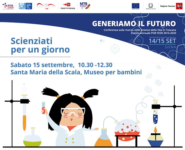 Il laboratorio per bambini. Ad arricchire il programma di sabato 15 settembre ci sarà uno speciale dedicato ai bambini. Il Museo d’arte per bambini del Santa Maria della Scala ospiterà “Scienziati per un giorno”, laboratorio organizzato dalla Fondazione Toscana Life Sciences. Dalle ore 10.30 alle 12.30 i giovani ricercatori dell’Università di Siena, della Fondazione VITA e di TLS racconteranno il mondo della ricerca e il loro lavoro attraverso giochi, esperimenti e attività di laboratorio, facendo leva sulla creatività, l’entusiasmo e la voglia di scoperta tipica dei bambini.
