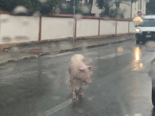 Sotto la pioggia, in mezzo alla strada, tra lo stupore degli automobilisti e dei passanti. Un maiale è stato avvistato quest'oggi a Castelfranco di Sotto, lungo via Provinciale Francesca Nord, all'altezza di un noto supermercato. A testimoniare il fatto una foto apparsa sul gruppo 'Sei di Castelfranco di Sotto se...' da un cittadino che si è trovato davanti l'animale. In poco tempo il traffico è stato bloccato per permettere di portare il maiale al sicuro. Una persona esperta l'ha 'agganciato' con una corda a mo' di guinzaglio, portandolo lontano dall'asfalto e dalle auto. Resta da capire chi è il proprietario e da quale zona è fuggito visto che l'area è pressoché industriale.