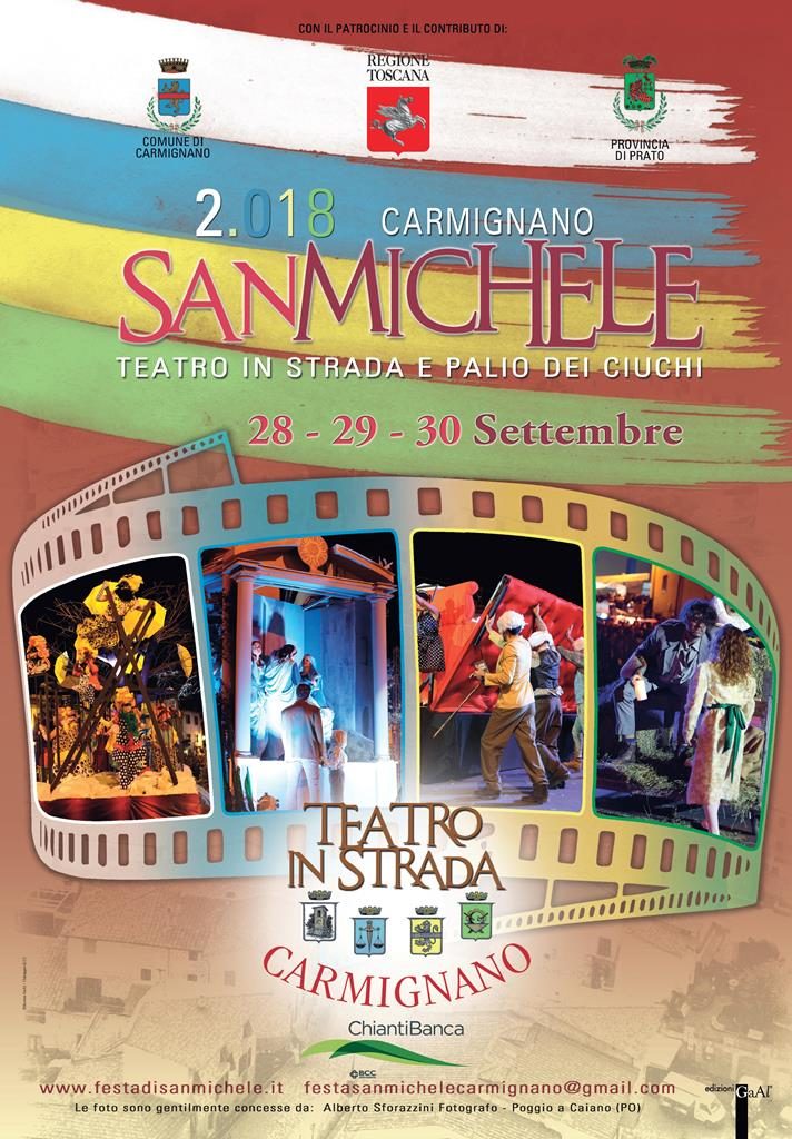 A Carmignano torna la magia della Festa di San Michele . Il 28, 29 e 30 settembre la piazza principale del borgo adagiato sulle colline pratesi si trasforma in un grande palcoscenico dove i quattro rioni del paese si sfidano, in onore del santo patrono, a colpi di teatro in strada e del tradizionale Palio dei ciuchi . La manifestazione è stata presentata mercoledì 19 settembre a palazzo Banci Buonamici a Prato, alla presenza della presidente del Comitato organizzatore per i Festeggiamenti del San Michele Silvia Borsi, del sindaco di Carmignano Edoardo Prestanti , del vicesindaco e responsabile dei rapporti con il San Michele Federico Migaldi, dei rappresentanti dei rioni – Giancarlo Ciapini per il Celeste, Elisabetta Cecconi per il Giallo e Stefano Spinelli per il Verde – e del titolare dell'Antica Osteria dei Mercanti Salvatore Pirronello , che anche quest’anno offre il trofeo.