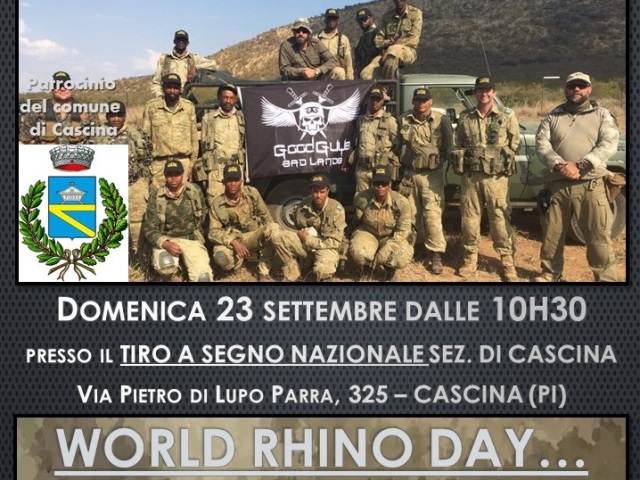 Domenica 23 settembre 2018, dalle ore 10.30, in occasione della Giornata mondiale del rinoceronte, il Tiro a segno nazionale di Cascina (in via Pietro di Lupo Parra 325), organizza il World Rhino Day, evento patrocinato dal Comune di Cascina, in collaborazione con il team Good Guys in Bad Lands e la Poaching Prevention Academy (Accademia di prevenzione del bracconaggio),