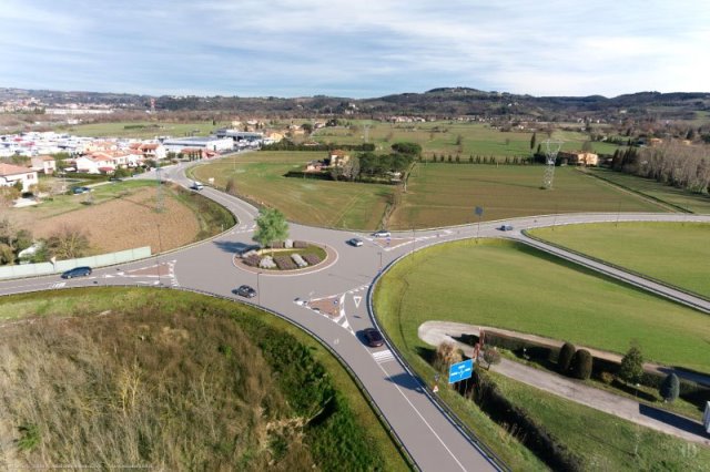 La rotatoria lato via Piovola ha un diametro esterno di 42 metri con un anello carrabile di 9,5 metri di larghezza, questa già in funzione aumenta la sicurezza di tutta via Piovola e funge anche da rallentatore del traffico sul rettilineo.