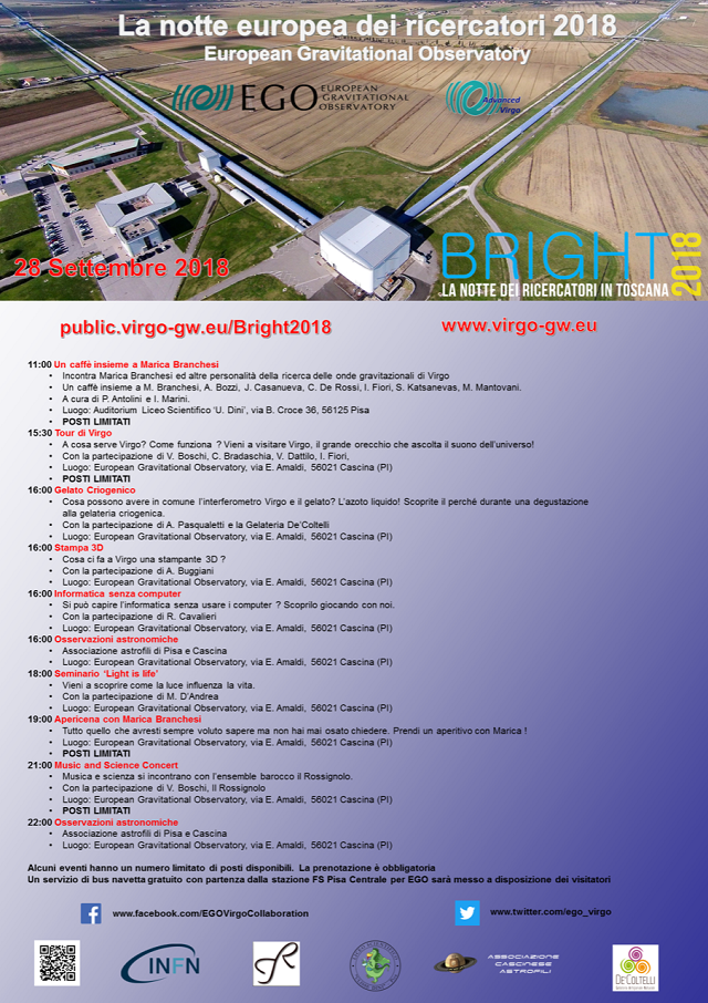 Oltre a Pisa, gli appuntamenti di BRIGHT 2018 saranno ospitati anche sul territorio: a Lucca, con un programma di eventi organizzati dalla Scuola IMT Alti Studi nel Complesso di San Francesco, a Viareggio, con iniziative dell’Istituto di Geoscienze e Georisorse del CNR ospitate a Villa Borbone, a Pontedera nel Polo Valdera della Scuola Sant’Anna, a Livorno nel Laboratorio Scoglio della Regina dell’Istituto di Biorobotica della Scuola Sant’Anna; a Cascina con tour guidati, conferenze e osservazioni astronomiche all’European Gravitational Observatory (EGO), sito dell’esperimento Virgo, che lo scorso anno ha rilevato segnali di onde gravitazionali in collaborazione con LIGO.