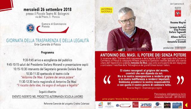 Scopo della sinergia è dare diffusione al messaggio contenuto nello spettacolo teatrale "ANTONINO DE MASI. IL POTERE DEI SENZA POTERE" (di Rosanna Magrini con Lorenzo Bartolini, Elisa Proietti, Stefano Tognarelli; musiche di Alfonso Belfiore; organizzazione Annastella Giannelli) e con esso circuitare nei teatri italiani.