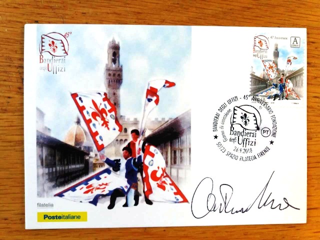 Presso la sede delle Poste Italiane di Firenze, in via Pellicceria, è stato presentato il francobollo e l'annullo filatelico dedicato ai Bandierai degli Uffizi per celebrare i 45 anni della rifondazione del gruppo. Erano presenti l'assessore al decentramento e biblioteche Massimo Fratini, l'assessore alle tradizioni popolari Andrea Vannucci, il presidente del Calcio Storico Fiorentino Michele Pierguidi, il direttore del Corteo storico della Repubblica Fiorentina Filippo Giovannelli ed il capitano dei Bandierai Antonio Marrone. Si tratta del primo francobollo italiano dedicato ad un gruppo di sbandieratori e per ricordare questo primo giorno di emissione verrà organizzato un evento il prossimo 24 ottobre nel Salone dei Cinquecento di Palazzo Vecchio.