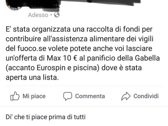 Pronta è arrivata la smentita da parte dei vigili del fuoco, che hanno spiegato come non sia affatto in piedi una raccolta fondi nel luogo citato su Facebook. I vigili del fuoco fanno sapere: "Cortesemente invitate le persone a non aderire a questo tipo di iniziativa in quanto non abbiamo assolutamente bisogno di alcun tipo di assistenza alimentare. In caso di emergenza ci sono le strutture di protezione civile preposte a questo tipo di attività, non solo per noi ma per tutti gli operatori del soccorso che intervengono".