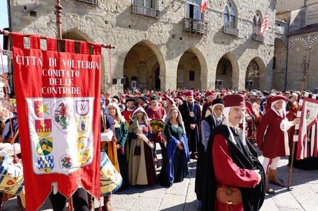 Una piazza colorata con oltre 500 figuranti di 15 gruppi storici per la giornata conclusiva del Festival dei Luoghi Medievali. Nutrita la delegazione volterrana con 90 figuranti. «Si è conclusa una tre giorni importante a Pistoia -. dichiara il sindaco Marco Buselli –, evento durante il quale con l'Associazione Comuni Luoghi del Medioevo, abbiamo messo questa epoca al centro dell'interesse. Volterra ha svolto un ruolo davvero notevole, con ben novanta dei cinquecento figuranti presenti sulla piazza. Voglio ringraziare il Comitato delle Contrade Città di Volterra, i Balestrieri ed il Gruppo Storico degli Sbandieratori Città di Volterra per essere riusciti a dare un'immagine forte e potente della città. La rappresentante di Enit presente, ha fatto capire che è possibile strutturare in tempi rapidi un segmento di turismo esperienziale che guardi al Medioevo come filo conduttore. Stiamo lavorando su questo».