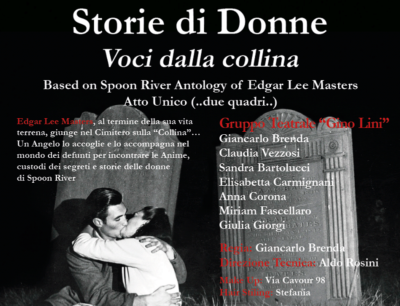 Il Dramma Popolare presenta venerdì 5 Ottobre al Teatro Verdi di Santa Croce sull'Arno, lo spettacolo "Storie di donne. Voci dalla collina" dall'antologia di Spoon River di Edgar Lee Masters. Lo spettacolo a ingresso libero, avrà inizio alle 21,15. Si tratta di un'esperienza importante perché il Dramma Popolare fa leva su un gruppo teatrale titolato a Gino Lini, che da anni è impegnato sulle scene dei teatri locali e vede la partecipazione di attori che , pur non professionisti, si dedicano con passione, entusiasmo, competenza e tenacia al teatro, sotto la guida di Giancarlo Brenda che, in questo spettacolo, interpreta contemporaneamente il ruolo di regista e attore e con la direzione tecnica di Aldo Rosini che da sempre svolge questo ruolo con passione, ingegno ed esperienza. L'iniziativa si pone nel quadro del programma della Fondazione Istituto Dramma Popolare di San Miniato di portare l'esperienza drammaturgica anche fuori della sede naturale, quella di San Miniato, per incontrare le persone là dove si riuniscono, nei teatri, sulle piazzi, nelle fabbriche, sui sagrati delle chiese.
