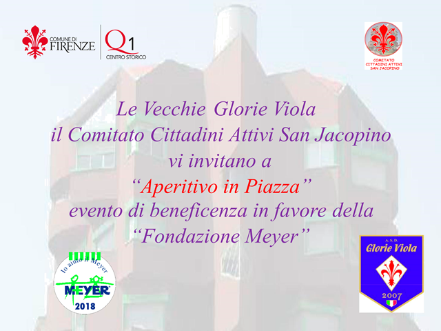 Il Comitato Cittadini Attivi San Jacopino, in collaborazione con le Vecchie Glorie della Fiorentina, ha promosso un incontro conviviale che si terrà Mercoledi 5 ottobre dalle ore 18 alle 21 in Piazza San Jacopino. L'evento realizzato grazie al generoso contributo di cittadini ed esercenti della zona, non ha solo lo scopo di rafforzare i legami sociali e con le istituzioni, ma sarà soprattutto un'occasione per effettuare una raccolta fondi a favore dell Ospedale pediatrico Meyer, che saranno consegnati a un responsabile della struttura sanitaria al termine della serata.