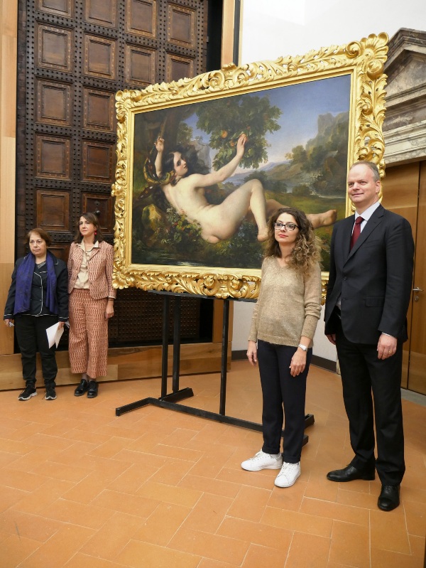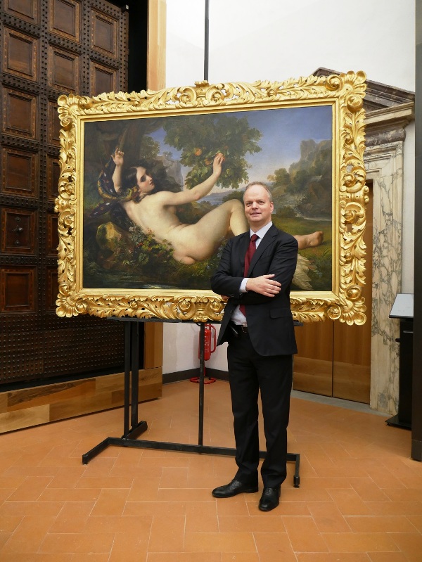 “Bezzuoli è in pittura ciò che il suo compatriota Bartolini è presso a poco in scultura” scrive Giuseppe Mazzini, sì proprio lui, uno dei Padri della Patria, nel mentre era esule a Londra nel suo Saggio sulla pittura moderna del 1841. All’Accademia di Belle Arti di Firenze, Bezzuoli ebbe come allievo Giovanni Fattori. Fra i due non correva molta stima e non c’è da stupirsene visto che il primo era fondamentale esponente di una pittura “storica” e romantica, dai toni altisonanti, e il secondo fu forse il più celebre interprete del realismo rappresentato dai Macchiaioli. La Galleria d’arte moderna di Palazzo Pitti possiede già opere dell’artista fiorentino, ma da nessun’altra si sprigiona la passionalità, la sensualità carnale che troviamo in questa. “La verità disarmante della figura di Eva – afferma il Direttore delle Gallerie degli Uffizi Eike Schmidt – fa del dipinto un cardine fondamentale nella storia della rappresentazione del nudo femminile, che agli Uffizi trova due esempi celeberrimi nella Venere di Urbino di Tiziano e soprattutto, per la scelta della veduta da tergo, nella Venere e Satiro di Annibale Carracci. Terminata dieci anni prima dell’Olimpia di Manet, che pure rimanda a quei prototipi, l’Eva di Bezzuoli fu un’opera rivoluzionaria per il suo tempo - in anticipo anche sul realismo spregiudicato di Courbet – e dimostra come Firenze nell’Ottocento ebbe un ruolo di primo piano sulla scena europea.”