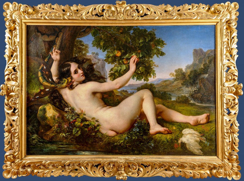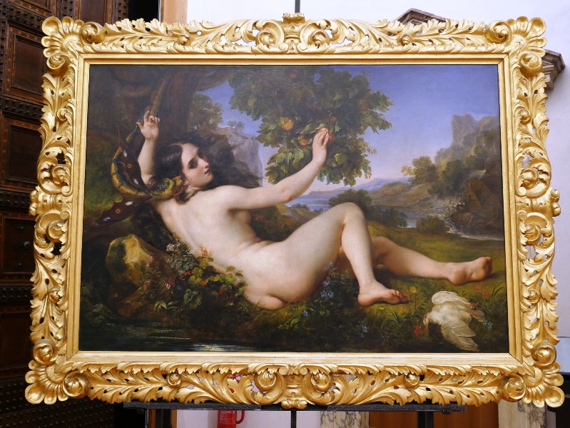 Nel quadro di Giuseppe Bezzuoli Eva tentata dal Serpente, il rettile ha denti aguzzi e lucenti scaglie dorate e verdi, preziose. Ne aumentano la bellezza e l’inganno le sottili e variopinte ali quasi di farfalla: la tentazione si veste di una promessa accattivante e splendente. il centro della scena è tutto occupato da Eva, nel trionfo della sua giovane e generosa nudità, che con gesto molle afferra la mela mentre ci lancia uno sguardo languido e complice, innocente e invitante, come a chiedere conferma di un fare maledetto. Il grande dipinto a olio su tela del fiorentino Bezzuoli, affrescatore di soggetti storici e creatore di immagini romantiche ed accademiche, è stato acquistato dalle Gallerie degli Uffizi per la Galleria d’arte moderna di Palazzo Pitti, ma dove sarà visibile dalla primavera prossima. Intanto, dal 26 ottobre fino al 17 marzo 2019, sarà esposto nella mostra Romanticismo organizzata dalle Gallerie d’Italia a Milano.