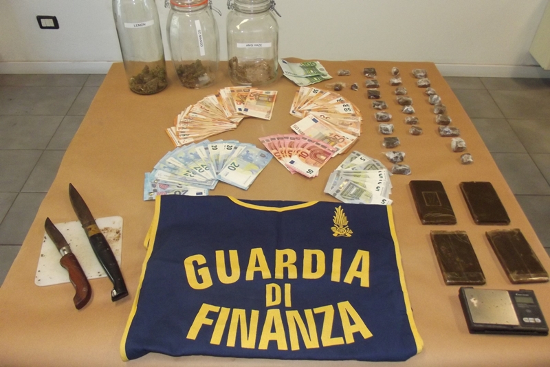 All’ulteriore richiesta di consegnare altre sostanze stupefacenti l’uomo ha risposto con fermezza di aver dato tutto quanto in suo possesso. La successiva perquisizione dell’abitazione lo ha smentito: le Fiamme Gialle hanno infatti individuato e sequestrato, in un comodino e in una cassettiera nella camera da letto, sei etti di hashish, divisi in quattro panetti e ventotto pezzi già tagliati e singolarmente confezionati nonché un bilancino di precisione, due coltelli e un tagliere con evidenti tracce di cannabis, oltre a contanti per 4.000 euro, ossia il ricavato di precedenti cessioni di stupefacenti.