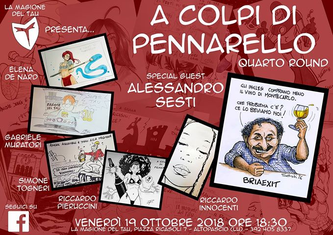 Torna A colpi di Pennarello, la performance artistica dei cinque "Cavalieri della Magione del Tau", Elena De Nard, Riccardo Innocenti, Gabriele Muratori, Riccardo Pieruccini e Simone Togneri. Il quarto round è fissato per venerdì 19 ottobre, dalle ore 18.30 fino a mezzanotte, a La Magione del Tau in piazza Ricasoli, 7 ad Altopascio in provincia di Lucca.