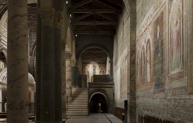 All’interno della Basilica l’illuminazione è stata graduata secondo precisi criteri gerarchici per enfatizzare gli elementi architettonici, gli affreschi e gli oggetti valorizzando l’armonia delle forme, la consistenza dei materiali, le opere e i simboli.