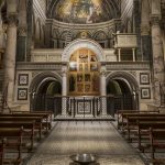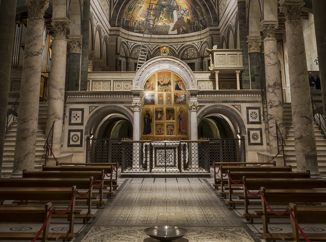 I fasci luminosi guidano lo sguardo verso il presbiterio e il catino absidale col suo meraviglioso mosaico, punto focale dell’architettura e fulcro della simbologia religiosa. Gli intarsi marmorei del pavimento, ricchi di riferimenti simbolici, sono illuminati zenitalmente da apparecchi fissati sulle capriate, realizzati su disegno – a evocare le lanterne tradizionali – e dotati di ottiche di precisione per far risaltare con nettezza ciascuna delle formelle.