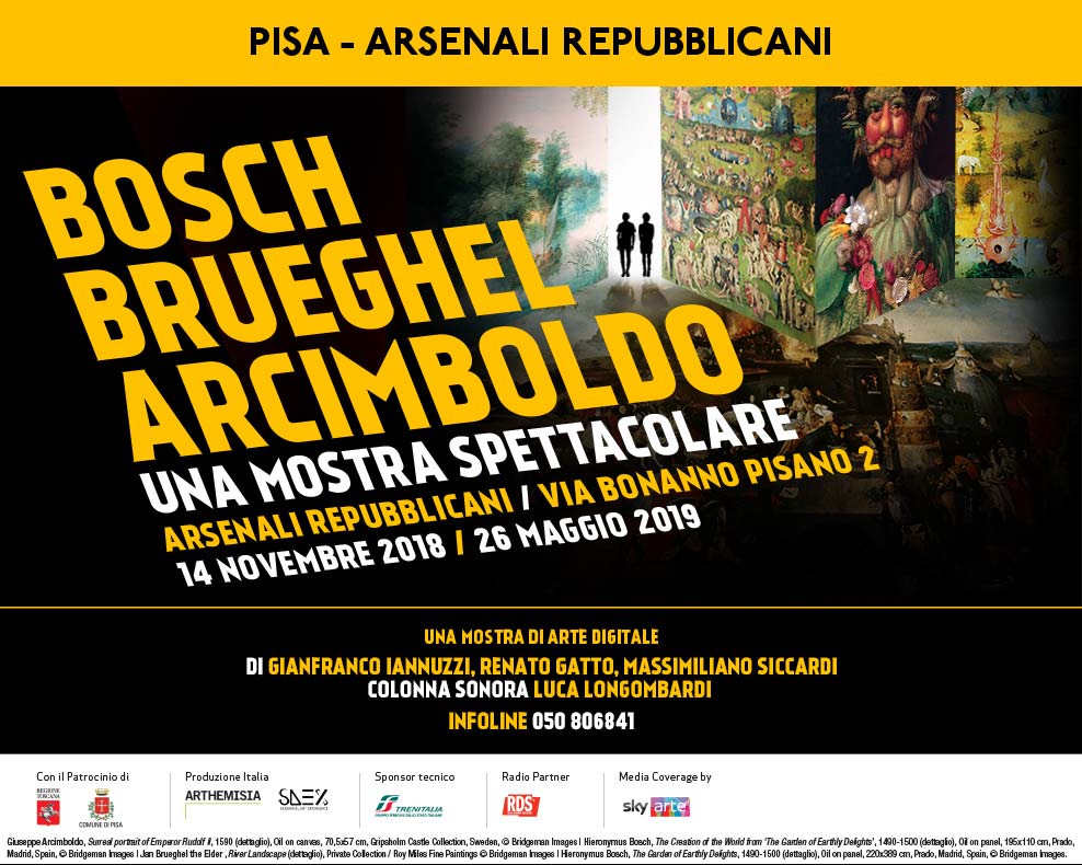 La grande mostra-spettacolo Bosch, Brueghel, Arcimboldo arriva dal 14 novembre agli Arsenali Repubblicani di Pisa: 54 proiettori ricostruiscono a 360 gradi magiche e sognanti atmosfere attraverso una combinazione di proiezioni, immagini, musiche e tecnologia, regalando al pubblico una totale immersione in opere uniche nel loro genere. Dallo stile fiammingo delle opere di Bosch e della dinastia Brueghel fino all’arte burlesca e metaforica di Arcimboldo.