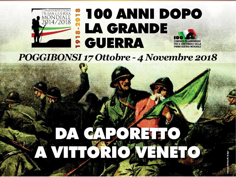 “Da Caporetto a Vittorio Veneto”. E’ questo il titolo del ricco calendario di appuntamenti che si svolgerà a Poggibonsi per commemorare il centenario della fine della Grande Guerra. Gli eventi si articoleranno da domani, 17 ottobre, fino al 4 novembre e si svolgeranno in diversi luoghi della città. Le iniziative sono organizzate dal Comitato Poggibonsese per il Centenario della Prima Guerra Mondiale con l’Associazione Storica Poggibonsese, l’UNUCI Siena, l’Unicoop Firenze in collaborazione con l’associazione Via Maestra Centro Commerciale Naturale.