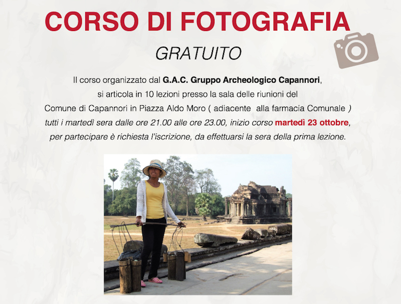 Il Gruppo Archeologico Capannorese in collaborazione con il Comune di Capannori organizza un corso gratuito base di fotografia. Si articola in 10 lezioni che si terranno tutti i martedì sera dalle ore 21 alle ore 23 a partire dal 23 ottobre nella sala riunioni del Comune in piazza Aldo Moro. Il corso è rivolto a tutti gli appassionati, sia a coloro che intendano muovere i primi passi, sia a coloro che già praticano e desiderino migliorare e arricchire le proprie conoscenze fotografiche.