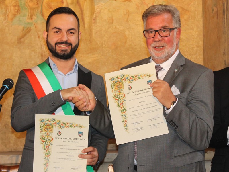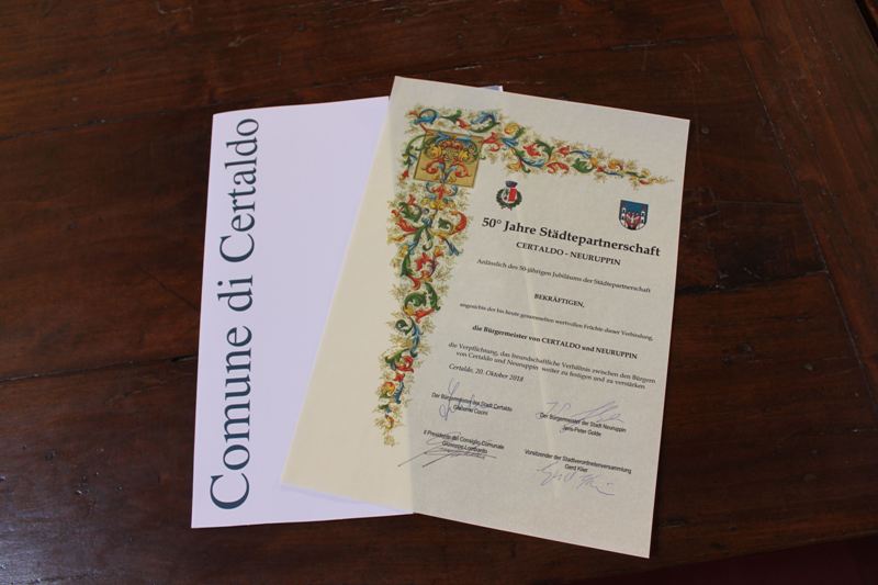 Si è svolta sabato 20 ottobre la cerimonia di celebrazione del cinquantesimo anniversario del gemellaggio tra il Comune di Certaldo ed il Comune di Neuruppin, con l'augurio da parte del Sindaco Giacomo Cucini per almeno altri 50 anni di gemellaggio.