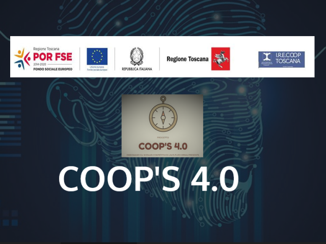 Coop's 4.0 è un progetto finanziato dalla Regione Toscana a valere sulle risorse F.S.E. 2016-2020 attraverso il "bando per la concessione di finanziamenti ex art. 17 comma 1 lett. a e comma 3 legge regionale n. 32/2002 per progetti formativi rivolti ad imprenditori su Industria 4.0, al fine di sostenere i percorsi di digitalizzazione delle imprese toscane, attraverso un intervento di formazione degli imprenditori gestito da Irecoop Toscana e promosso da Confcooperative Toscana.