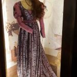 Abito da festa in seta stampata rosa a motivi geometrici e floreali neri. Maniche in faille di seta rosa con ricami neri ripresi da un ritratto di dama di Antonio del Pollaiuolo Tessuto Hopkins&Hopkins-Londra Gioielli Tharros Bijoux -Firenze Sartoria Lux Vide-Roma