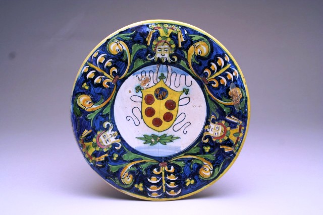 Nella foto il piatto esposto al museo della Ceramica: Pozzo dei Lavatoi, Grottesca Piatto con stemma Medici 1510-15.