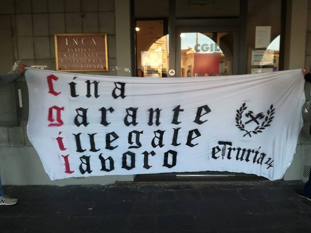 "Per la seconda volta nell’ultimo anno l’associazione fascista Etruria 14 ha lasciato uno striscione davanti alla sede della nostra Camera del Lavoro con l’intento di denigrare e minacciare il sindacato". Con queste parole attraverso un post su facebook la Cgil di Prato denuncia quanto accaduto nella notte: davanti alla sede di piazza Mercatale è stato attaccato uno striscione da parte del gruppo neofascista Etruria 14 con una manomissione offensiva dell’acronimo Cgil, che suonava così: Cina Garante Illegale Lavoro.