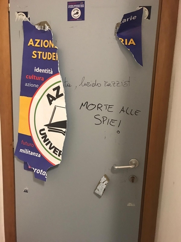 “Nella mattinata di oggi abbiamo trovato la porta della stanza concessa dall’Università alla nostra lista in quanto democraticamente eletta negli organismi istituzionali universitari imbrattata da minacce. Non è accettabile che all’interno di aule universitarie possa succedere che in modo indisturbato e impunito alcuni nullafacenti possano imbrattare con minacce e offese aule di rappresentanza studentesca vissute da studenti che tutti i giorni con sacrificio si impegnano per migliorare l’università.”