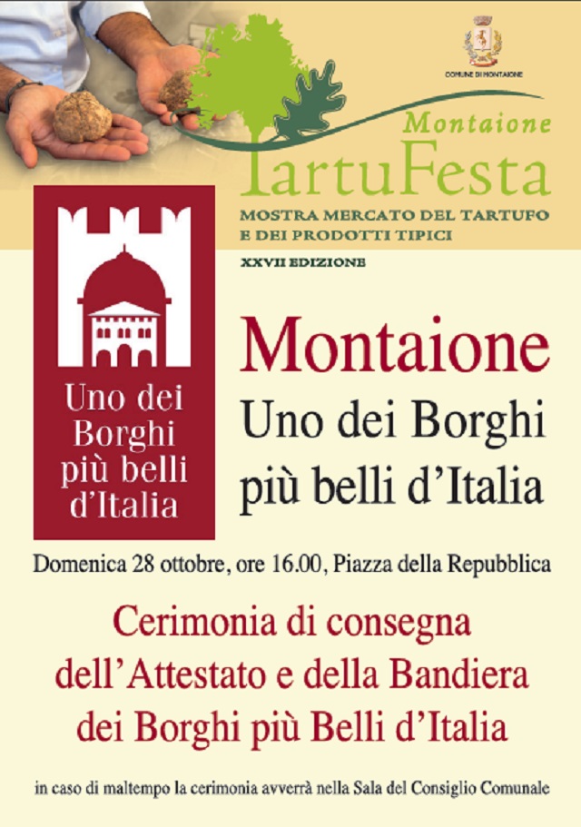 Domenica 28 ottobre 2018, a Montaione, nell’ambito della manifestazione Tartufesta. Mostra Mercato del tartufo e dei Prodotti Tipici, avverrà la cerimonia di consegna al Comune dell’Attestato e della Bandiera dei Borghi più Belli d’Italia.