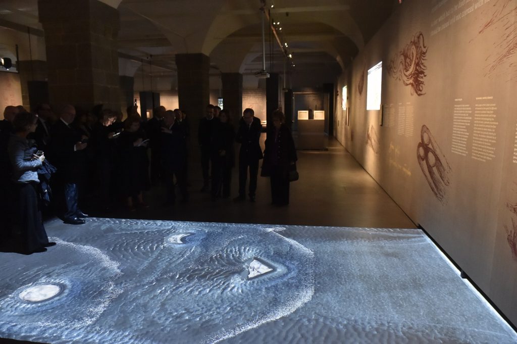 Particolarmente suggestiva, nell’allestimento, è la proiezione sul pavimento del cadere di gocce d’acqua e dello scorrere dei ruscelli: il visitatore prova quasi l’effetto di immergervi i piedi, come il Cristo e il Battista che affondano nel fiume Giordano fino alle caviglie nel Battesimo di Cristo dipinto da Leonardo insieme al maestro Verrocchio ed esposto, nella nuova sala dedicata al da Vinci, solo due piani sopra, agli Uffizi.