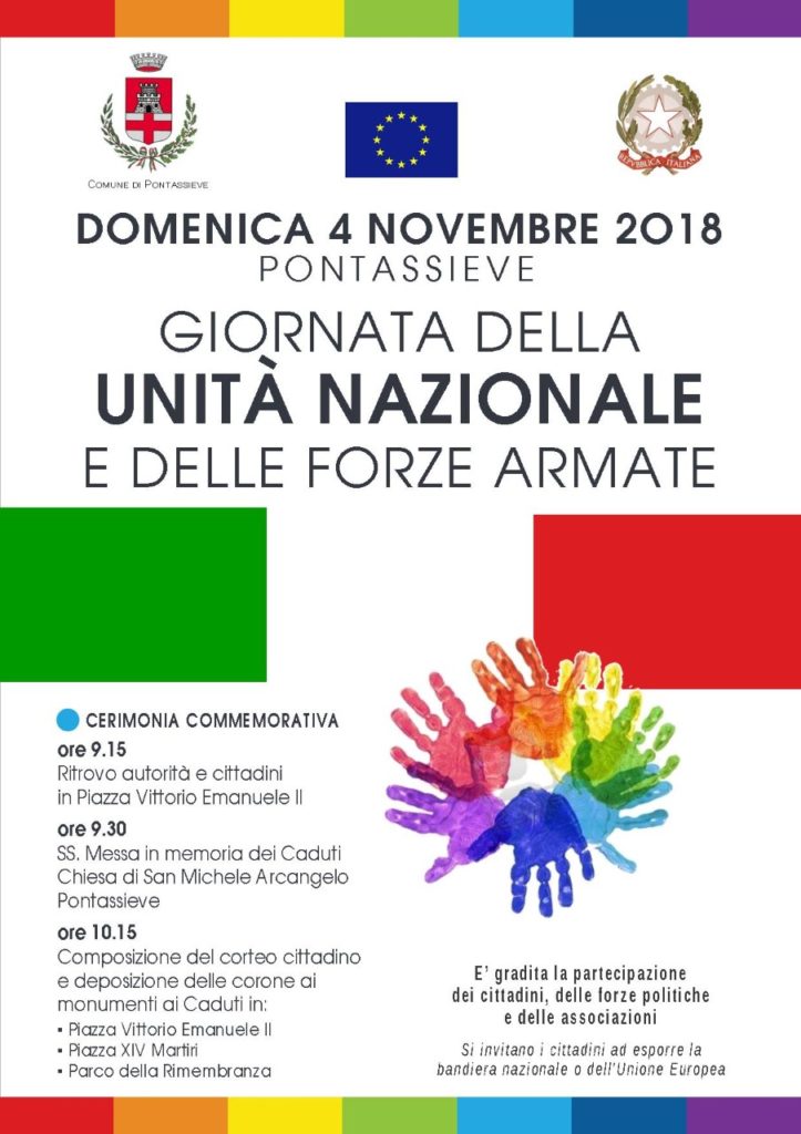 Domenica 4 novembre l’amministrazione comunale celebra la Giornata dell'Unità Nazionale e delle Forze Armate. La cerimonia avrà inizio alle ore 9.15 in piazza Vittorio Emanuele II con il ritrovo di cittadini e autorità, alle ore 9.30 seguirà la Santa Messa presso la chiesa di San Michele Arcangelo e, dalle ore 10.15 corteo e deposizione delle corone ai monumenti ai Caduti presenti a Pontassieve (Piazza Vittorio Emanuele II; Piazza XIV Martiri e Parco della Rimembranza). Durante la giornata rappresentanti dell’Amministrazione poseranno una corona di alloro anche agli altri 16 monumenti ai Caduti dislocati in tutte le frazioni del Comune di Pontassieve.