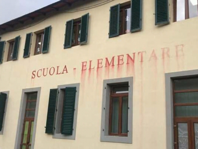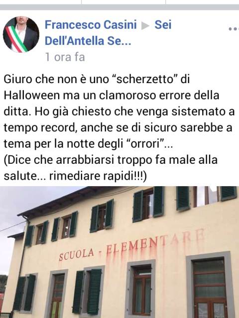 Uno 'scherzetto' di Halloween o un errore della ditta? Stamattina l'iscrizione della scuola elementare Michelet dell'Antella a Bagno a Ripoli, è venuta giù in rivoli rossi, a sporcare il muro esterno dell'edificio scolastico. A fare chiarezza sui social è stato il sindaco di Bagno a Ripoli Francesco Casini, che ha pubblicato la foto dell'incidente occorso alla scritta e ha commentato: "Giuro che non è "uno scherzetto" di Halloween ma un clamoroso errore della ditta. Ho già chiesto che venga sistemato a tempo di record, anche se di sicuro sarebbe a tema per la notte degli orrori-conclude il sindaco- (Dice che arrabbiare fa male alla salute, rimediare rapidi!) scherza."
