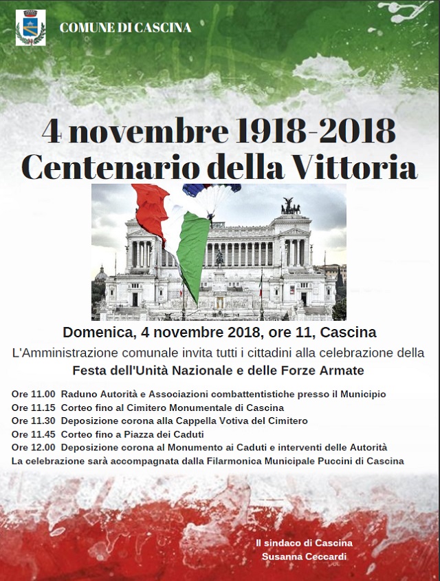 Domenica 4 novembre il Comune di Cascina celebrerà la Festa delle Forze armate e dell’Unità nazionale, nel giorno del centenario della fine della “Grande Guerra”, per ricordare i caduti di tutte le guerre.