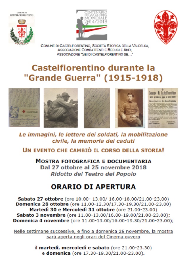 Domenica 4 novembre ricorre il Centenario della fine della “Grande Guerra” e Castelfiorentino conferma il suo impegno per riservare a questo appuntamento l’attenzione che merita: dopo l’inaugurazione della mostra al Ridotto del Teatro del Popolo, con centinaia di foto, cimeli e documenti inediti, la mattinata di domenica prevede infatti l’inaugurazione di altri due poli espositivi: a Castelnuovo d’Elsa e all’Oratorio di San Carlo (via Testaferrata).