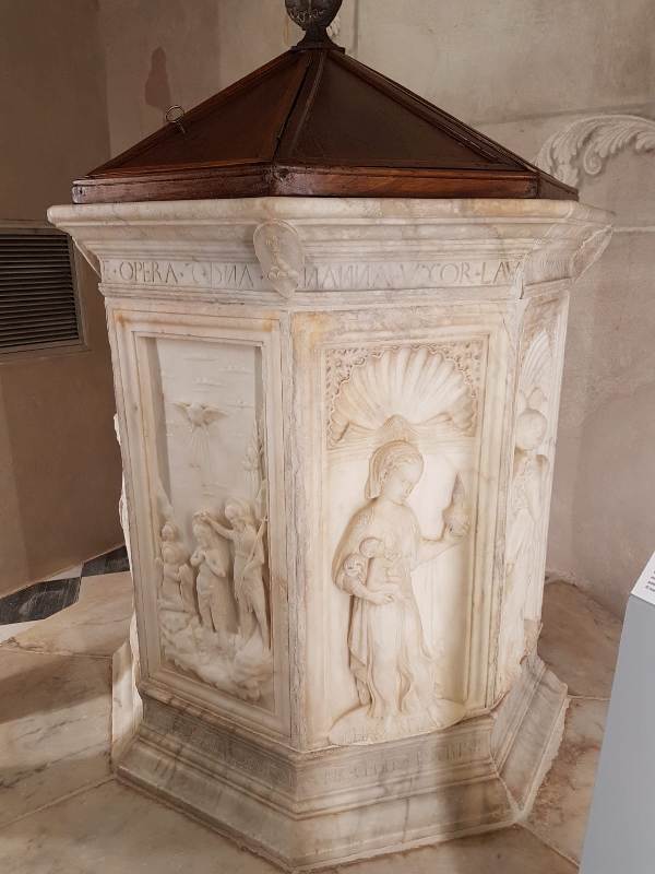 “Questo Battistero è tutto di marmo bianco di forma ottangolare, con figurine a basso rilievo, il tutto condotto con gran diligenza...” Con tali parole nel 1745 Valentino Felice Mannucci, podestà di Castelfiorentino con la passione per i viaggi tipica dl Settecento, descrisse il Fonte Battesimale di Santa Maria a Monte, realizzato nel 1468 da Domenico Rosselli detto “Il Rossello”.