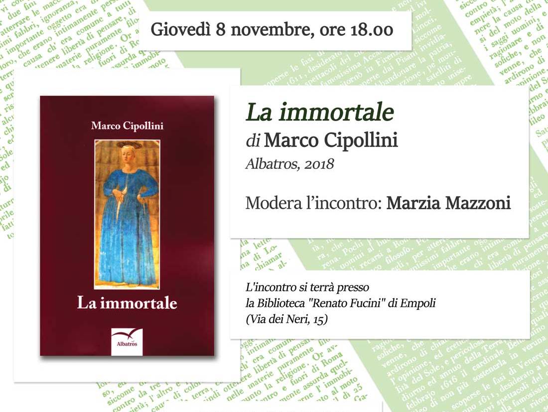 Nuovo ciclo di incontri per la rassegna culturale degli autori a km zero di casa nostra, dal titolo “Empoli che scrive”, promossa dalla biblioteca Comunale Renato Fucini di Empoli. Primo appuntamento giovedì 8 novembre 2018, alle 18, nella suggestiva cornice del Cenacolo degli Agostiniani (Via dei Neri, 15), con la presentazione del romanzo di Marco Cipollini intitolato “La immortale”. L’ingresso è libero. Un libro polifonico ma felicemente unitario, condotto su tre filoni narrativi intrecciati: la storia d’amore di Teresa, una donna empolese, la successiva vicenda passionale del prof. Petri (di lei vedovo) e della sua bellissima allieva, Elena Paternò e infine l’inserto romanzesco di vasto respiro, di ambientazione ellenistica, nato dalla fantasia di Petri e dal quale prendono forma vivente i suoi fantasmi erotici.