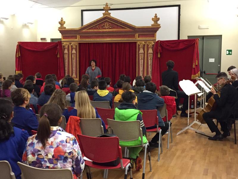 I 4 attori di Venti Lucenti hanno guidato i giovani alunni in una storia divertente e a tratti strampalata, fatta da decine di personaggi che cambiano continuamente di costume, di ruolo, di stato, ma anche di parole, di note meravigliose (opere, concerti, sonate, minuetti, musica sacra) e poi castelli, abbazie, regge, teatri, imperatori, re, papi, duchi, marchesi, cantanti svenevoli, compositori e inventori, odio, desideri, passioni.