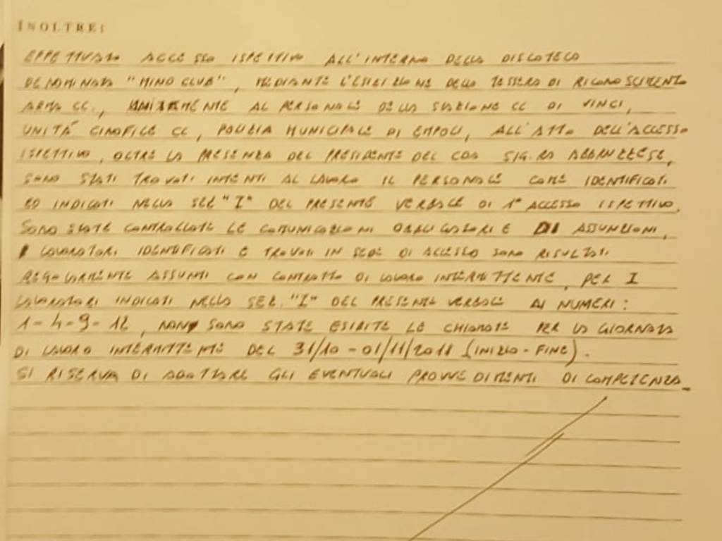 Il consulente Fontanelli: "Dal verbale non risulta personale a nero, ci sono 15 soggetti tutti regolarmente assunti, per 4 di loro, con contratto a chiamata, non è stata fatta la comunicazione di chiamata preventiva all'ispettorato del lavoro. La mancata comunicazione è una formalità, se fossero stati presi a lavoro in nero avrebbero rappresentato oltre il 20% della forza lavoro e l'attività sarebbe stata sospesa". "Abbiamo fatto la comunicazione immediatamente quando ci è stata contestata", spiega ancora. La sanzione prevista per irregolarità di questo tipo va dai 400 ai 2.400 euro.